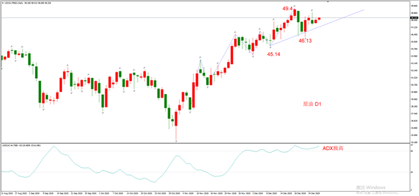 原油的日线走势近期并没有太大变化,最新回撤勾形为45.14~49.4~46.13,左侧波段持续时间足够,但右侧回撤幅度过大,代表多头力量并不能激发新一轮较大的涨幅。笔者对原油的多头判断属于长期分析,因为需求面会随着辉瑞疫苗的普及而不断提高,油价也会因之受到提振。但疫苗的普及在2021年二季度之后,在这之前,原油出现深度调整和宽幅震荡都不算奇怪。