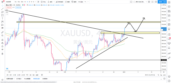 策略解析:黄金早盘跳空高开,并且持续上行,强势突破三角收敛形态,方向选择已经明了,后市或将继续上攻,延续逢低买入思路。日内关注价格是否有机会再次回踩1907一线附近的机会,可择机逢低买入黄金,目标可依次上看1935、1951一线。