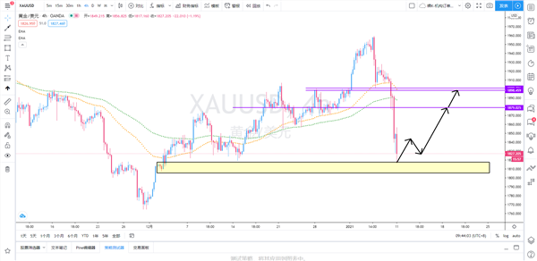 策略解析:黄金上周五出现大跌走势,一度连续跌破几道支撑位,因此,黄金短期内基本奠定为空头格局。但是由于超跌比较严重,暂时不宜再去追空,短线交易或将迎来一波反弹。日内关注价格在触及4小时级别需求区1817.50-1805.50能否出现企稳,如出现企稳形态,可在价格二次回踩1828.50一线附近择机逢低买入黄金,短线反弹上看目标1879、1898一线。