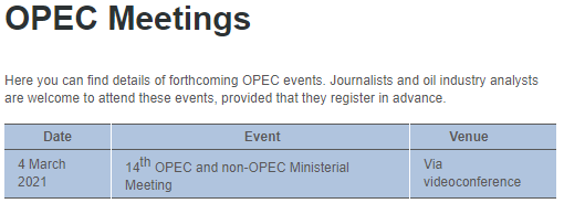 以上关于原油是市场的数据,均来自于OPEC每月发布的市场月报,交易者可以登录OPEC官网进行下载观看。除了月报之外,还有一个需要特别关注的事件,就是OPEC会议。该会议决定了OPEC成员国在未来的一个周期到底是减产还是增产,对于原有价格的长期走势具有重要的前瞻意义。OPEC会议的举办时间不固定,每年召开的次数也不尽相同,比如2020年全球宏观经济出现剧烈变动,OPEC就举办了6次会议;2019年国际环境较为稳定,OPEC只举办了2次会议。上次OPEC会议召开的时间是在2021年1月4日,而下次会议何时召开,还需要等待OPEC官方给到确定时间,目前是不确定的。