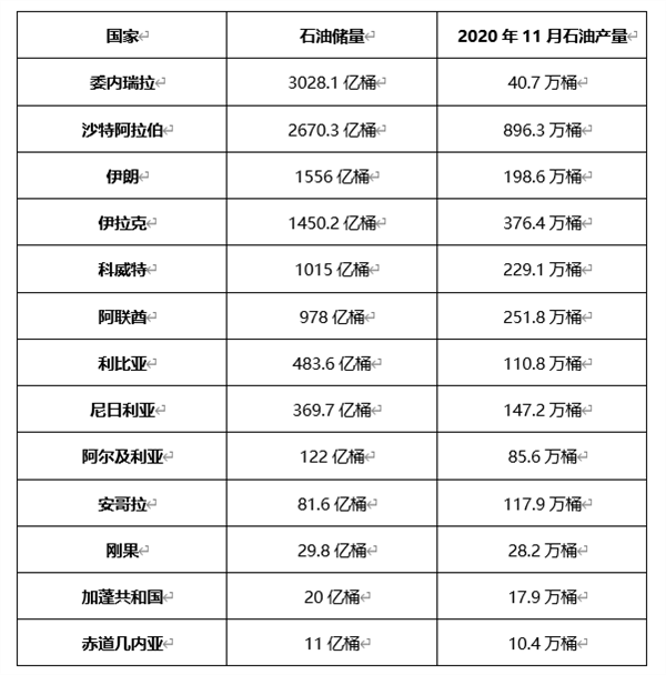 随着时间的推移,OPEC规模不断扩大,成员国也已经增长到了14个。只是在2020年1月份,原成员国厄瓜多尔,也就是欧佩克最小的成员国,宣布脱离OPEC组织。原因是无法忍受减产计划所导致的本国经济衰退,想要通过“退群”来提高本国的石油产量。自此,OPEC总的成员国减少为13个,下表对这些成员国做了基本数据汇总。