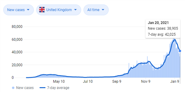 疫情确诊病例自1月8日到达高峰后,逐步下降。从趋势图来看,英国的第三波疫情开始逐步得到控制。