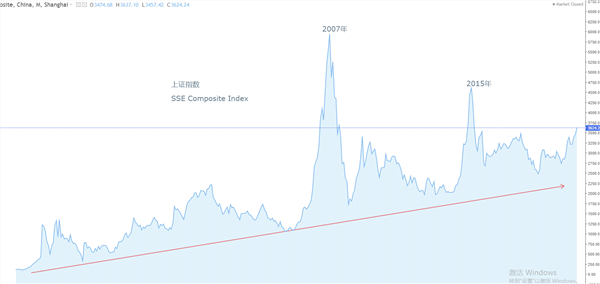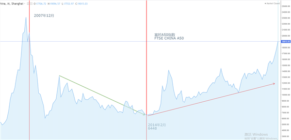 很多人的记忆停留在2007年上证指数暴涨之后随即迎来大跌和2015年暴涨之后随即迎来大跌的模式中。认为中国A股市场并不存在真正的稳定牛市,而是由于散户占比较高,导致“疯牛”和“股灾”的极端情况交替出现。我们可以观察上图中的红色上升趋势线,从上证指数有记录以来(1990年至今),其阶段性高点确实是忽上忽下,但其阶段性低点却是稳步上涨。包括2007年和2015年的股灾之后,虽然经历了80%以上的大跌,但并没有击穿前期的低点。这也意味着,中国A股市场一直处于“另外一种模式”的慢牛行情之中。之所以说“另外一种模式”,是因为大家都非常熟悉美国股票市场的牛市模式,也就是小幅回调+小幅上涨。但是,中国的慢牛有自己的特征,它属于大幅涨跌+底部缓慢抬高的牛市模式。造成这种现象的原因,或许是A股市场的炒作氛围更加浓厚,当一波行情来临时,众多场外资金涌入,导致实时价格严重偏离上市公司和国家经济的基本面。在泡沫达到顶峰之后,毫无意外的出现大跌行情。之前跟风进场的资金又开启了“抱头鼠窜”的溃逃。但总有那些长线资金,在A股跌至价值线后,开启买入模式,从而实现了上证指数和富时A50指数在数十年间的底部抬高。