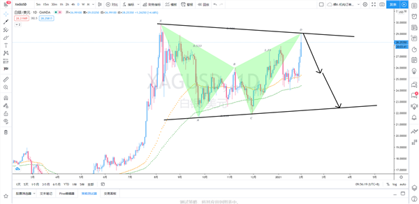 策略解析:白银早盘跳空高开,一度触及29一线附近,涨势狂热,但是价格已然来到高位强卖压位置,并且在此位置正好完成看跌蝙蝠模式,因此,对于白银,不宜再去追高做多,而是耐心等待有没有做空的机会。日内关注价格在28.20-28.30附近的K线反应,可择机清仓尝试做空白银,短线下看目标25.50、22.50一线。