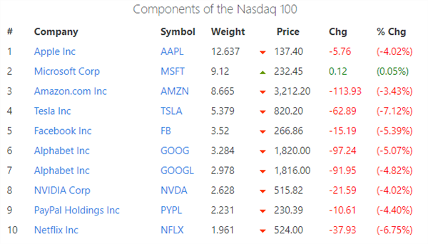 可以看出,Apple(苹果)所占权重高达12.637%,这一比重超过了数十支低权重个股的权重总和。前十支权重股的权重总和,经过简单计算后,为52.403%,占据纳斯达克指数的半壁江山。这是非常畸形的权重分配模式,无法体现大部分个股的涨跌表现。