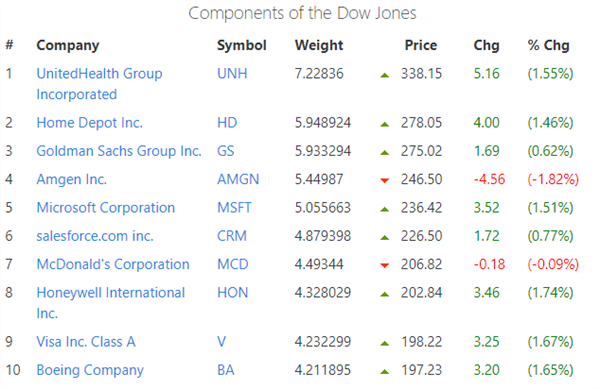 可以看出,道琼斯的前十大权重股,只有微软(MSFT)与纳斯达克和标普500指数重合,其它都是不相同的股票。这也意味着,道琼斯的整体走势,与另外两支股票指数的走势会出现一定程度的差异。虽然权重股不同,但权重的畸形分配是一样的。道琼斯工业平均指数的前十大权重股的总和权重为51.76%,同样的,机构想要让股票指数走势变得漂亮,根本没必要在意剩下的几百只股票,只要买入这十支权重股就可以。