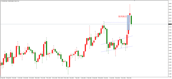 日线级别,白银并没有明确的上涨结构。虽然因为美国散户的进入,白银已经在上周四、上周五和本周一连续收出三根长阳线,但在这之前的震荡结构压制了场外资金参与多头的热情。除非美国散户能够一鼓作气,让白银走出持续两周以上的单边上涨行情,不然无法扭转白银持续宽幅震荡的中期趋势。