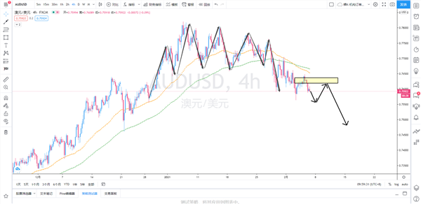 策略解析:澳元4小时级别多重顶部形态形成,并且跌破重要颈线位置,已经确认其有效性成立。价格跌穿均线系统,导致均线系统开始出现下跌排列迹象,因此,澳元后市或也将迎来下跌走势,以逢高做空为主。关注价格之后能否回抽上方供给区0.7618-0.7637的机会,可择机逢高做空澳元,下看目标0.7480一线附近。