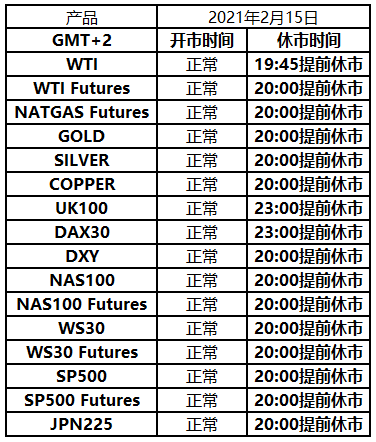 GKFXPrime温馨提醒您:2021年2月15日是美国总统日,届时部分产品的交易时间会受影响有所调整。具体安排请看下图: