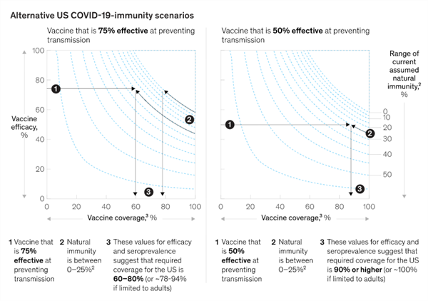除此之外,疫苗的有效性也是被广泛提到的一个问题。就美国数据来看,如果疫苗有效性为50%,那么疫苗覆盖率必须达到90%以上才能达到群体免疫的效果,因此接种花费的时间可能比预计的更久。