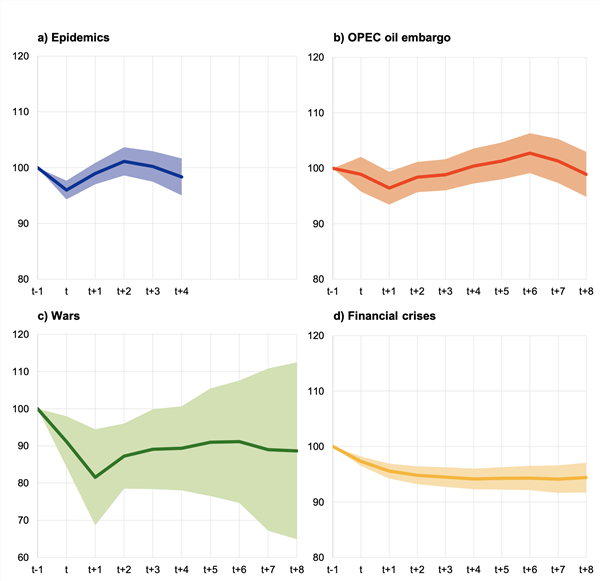以过去发生过的四个危机——流行疾病、原油危机、战争、金融危机为例,在危机发生过后的几年里,潜在的产出增长都受到了一定程度的抑制。