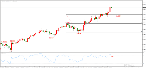 综合判断:短期目标1.4071已经被触及,未来走势较难判断,直至出现顶分形再做分析。在顶分形出现之前,保持多头持续的观点。