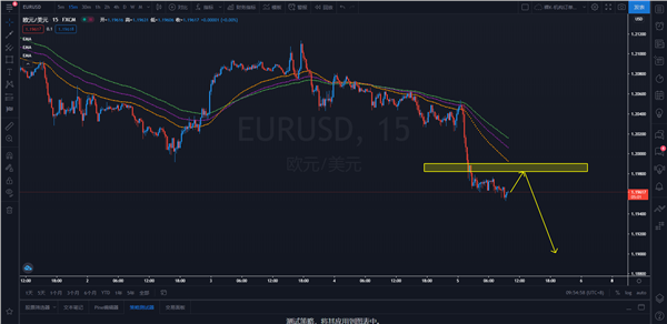 策略解析:欧元价格隔夜大跌,15分钟周期呈现绝对空头主导趋势,继续保持高空思路。日内关注价格再次回抽1.1982-1.1990供给区的机会,可择机逢高做空欧元,下看目标1.1900一线附近。