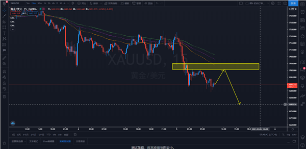 策略解析:黄金价格依旧呈现大空头的趋势,逢高做空思路不变。日内关注价格再次回抽1700.55-1704供给区的机会,可择机逢高做空黄金,下看目标1680一线附近。