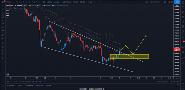 策略解析:黄金价格在触底后开始出现反弹修正走势,小时级别已经突破下降楔形的压制,可能在短线上会延续反弹的走势,关注逢低买入的机会。日内等待价格能否再次回踩1703.75-1696.55需求区的机会,可择机逢低买入黄金,短线上看目标1735.50一线附近。