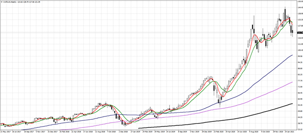 技术分析角度看,苹果周线图有回调到100美元的可能。长期趋势依然是向上运行。