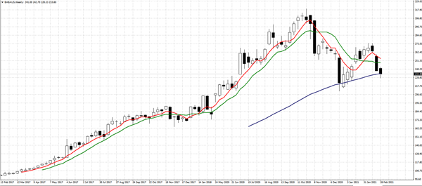 周线图上分析目前在233美元有一定支撑,在60周均线反复后,有继续回落到210美元附近可能。