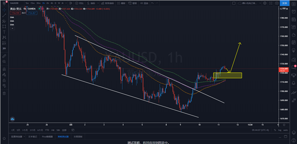 策略解析:黄金小时级别突破下降楔形,均线系统开始呈现多头排列,短期或将开启反弹上涨,不宜再过分看空,可以逢低买入为主。日内关注价格再次回踩1720-1714需求区的机会,可择机逢低买入黄金,上看目标1753一线附近。