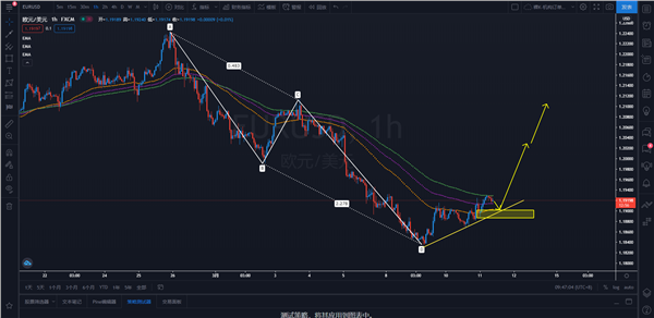 策略解析:欧元小时级别AB=CD模式完成,开始出现底部企稳迹象,不宜再去过分追空或者看空,走势或将出现反弹,短线可以逢低买入为主。日内关注价格再次回踩1.1900-1.1887需求区的机会,可择机逢低买入欧元,依次上看目标1.2030、1.2105一线附近。