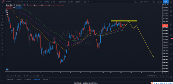策略解析:黄金小时级别受到上方强压,反弹走势或将出现终结迹象,下跌趋势可能将重新回归,密切留意上方1737一线附近的压制情况。日内在价格接近1737一线附近时可择机轻仓左侧博弈黄金空头,有效止损1742,依次下看目标1710、1690一线附近。