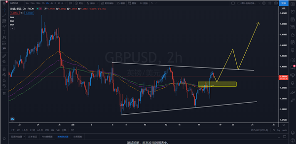 策略解析:欧元2小时级别价格突破下降楔形,并且再次回到均线系统上方,形势开始明朗,以逢低买入为主。日内关注价格再次回踩1.1953-1.1933区域的机会,可择机逢低买入欧元,依次上看目标1.2100、1.2200一线附近,以期价格能够完成潜在蝙蝠模式。