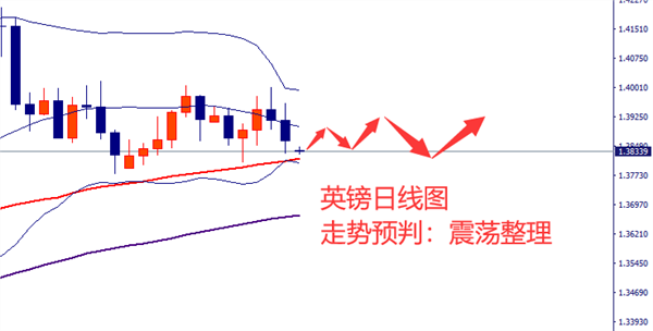 英镑周线图,英镑上周维持震荡,下跌趋势缓解,收盘在1.3850附近,周线以实体阴线收盘,本周有望延续下跌。日线图英镑受到布林带中轨1.3940的压制,均线系统有调整需求,长周期均线依然在低位形成支撑,短周期均线偏离值较大,需警惕英镑的调整风险,目前布林带中轨1.3950有较强压力,MACD指标,上涨动能开始减少,整体看,英镑本周倾向于反弹下跌,关注1.3800支撑和1.3900附近压力,先空后多。