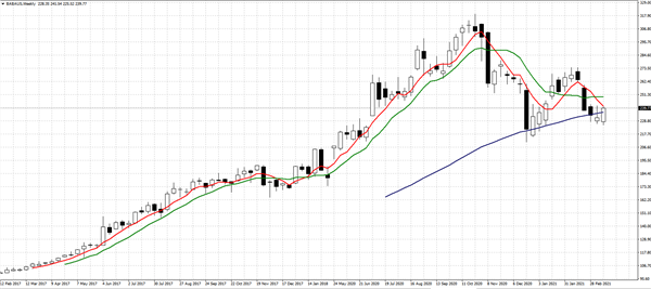 周线图上分析目前在233美元有一定支撑,在60周均线反复后,有继续回落到200美元附近可能。