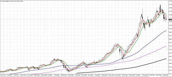 技术分析角度看,苹果周线图有回调到100美元的可能。长期趋势依然是向上运行。