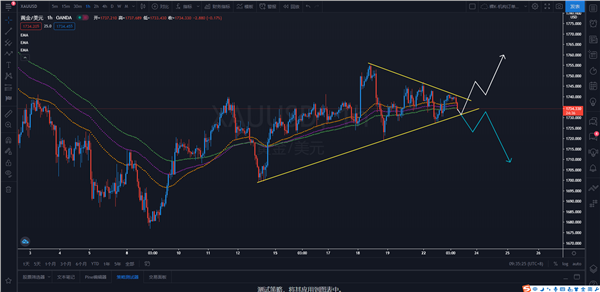 策略解析:黄金1小时级别出现三角收敛形态,并且基本已经进入震荡末端,很快将会选择方向进行突破,因此,可等待右侧突破确认信号后顺势入场即可。日内关注收敛形态的突破形态,顺势介入,上行目标看至1760一线,下行目标则看向1710一线附近。