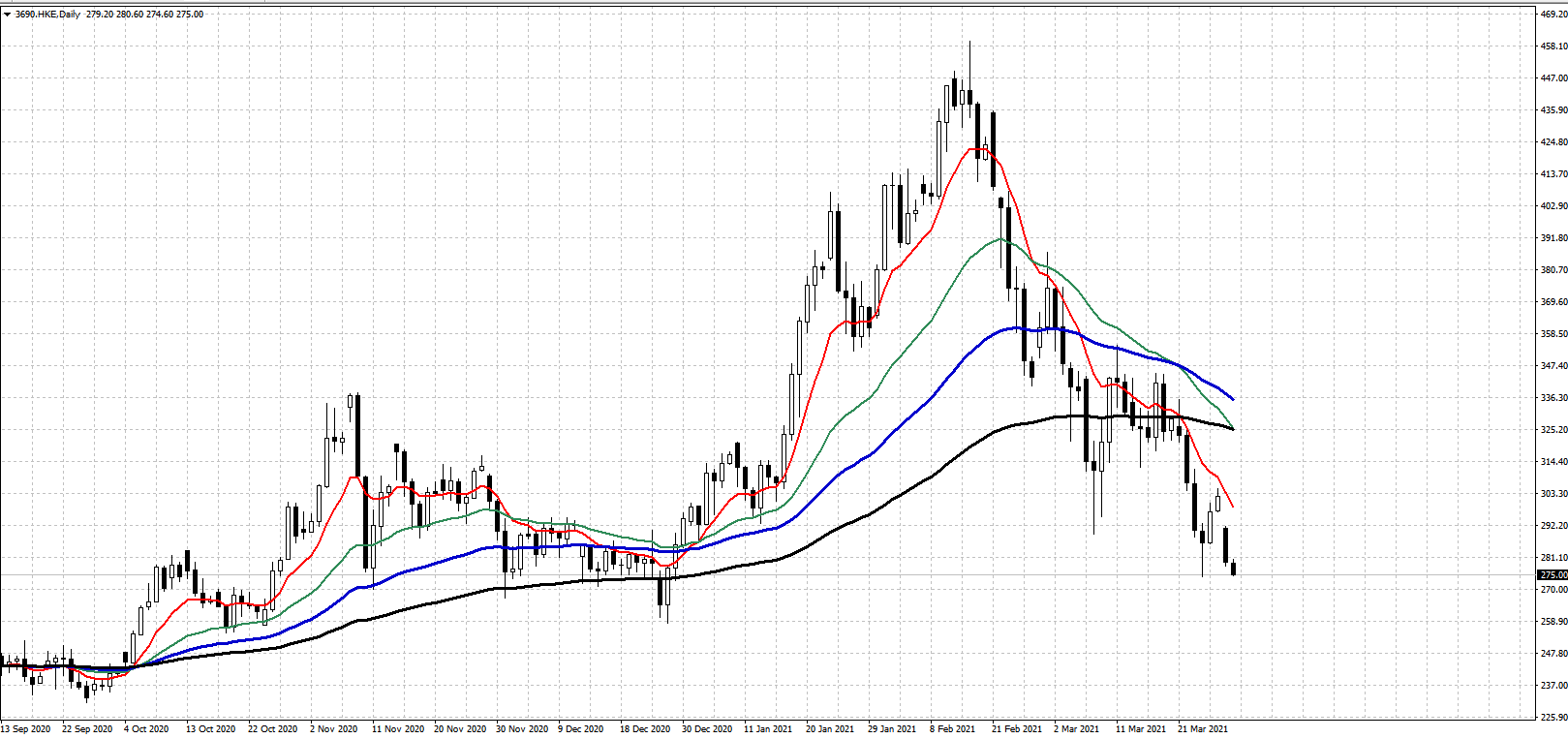 技术面上已经跌到本专栏前期分析的280底部区间,这一位置可以短线做多。但是要注意,长期看美团股价向上空间不大。