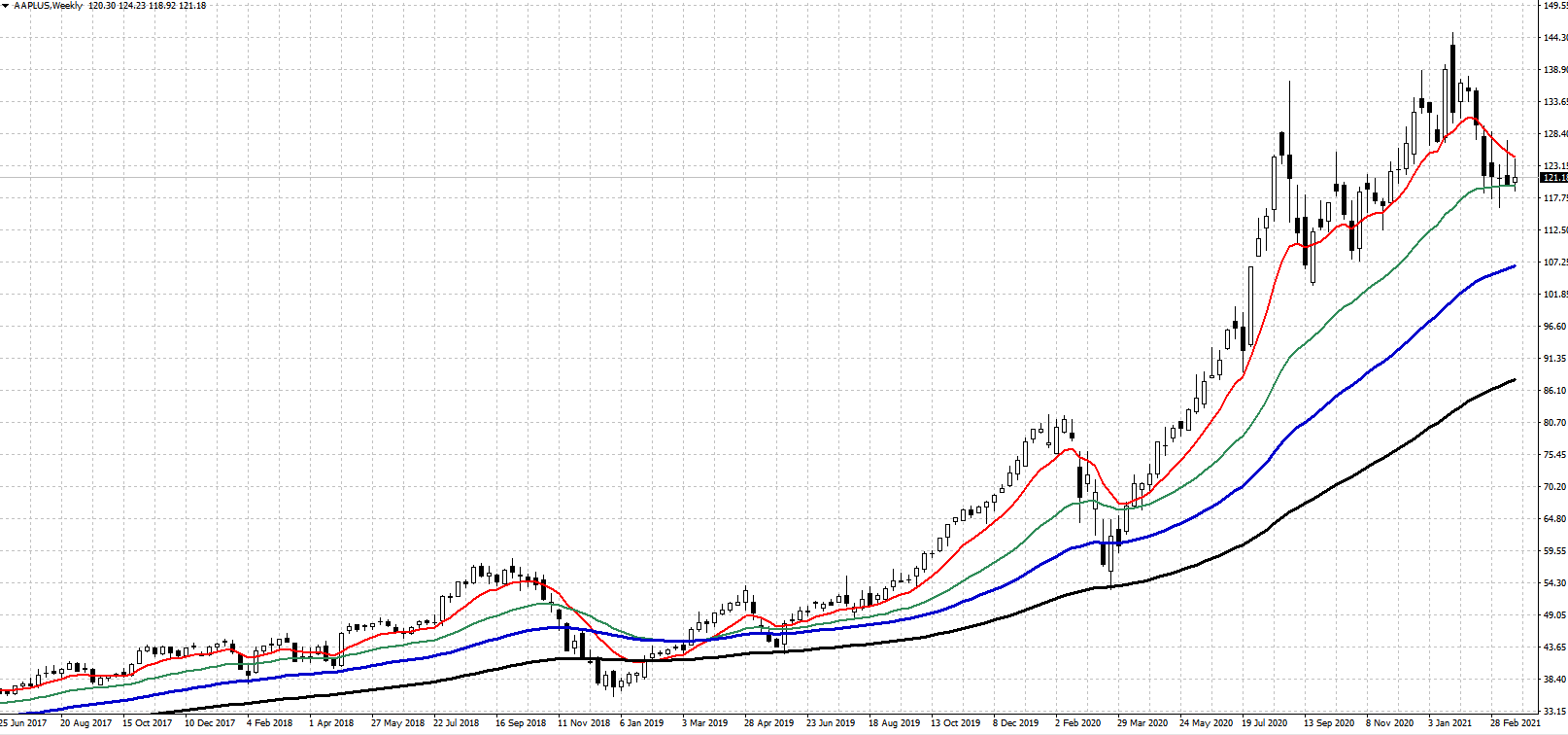 技术分析角度看,苹果周线图有回调到100美元的可能。长期趋势依然是向上运行。
