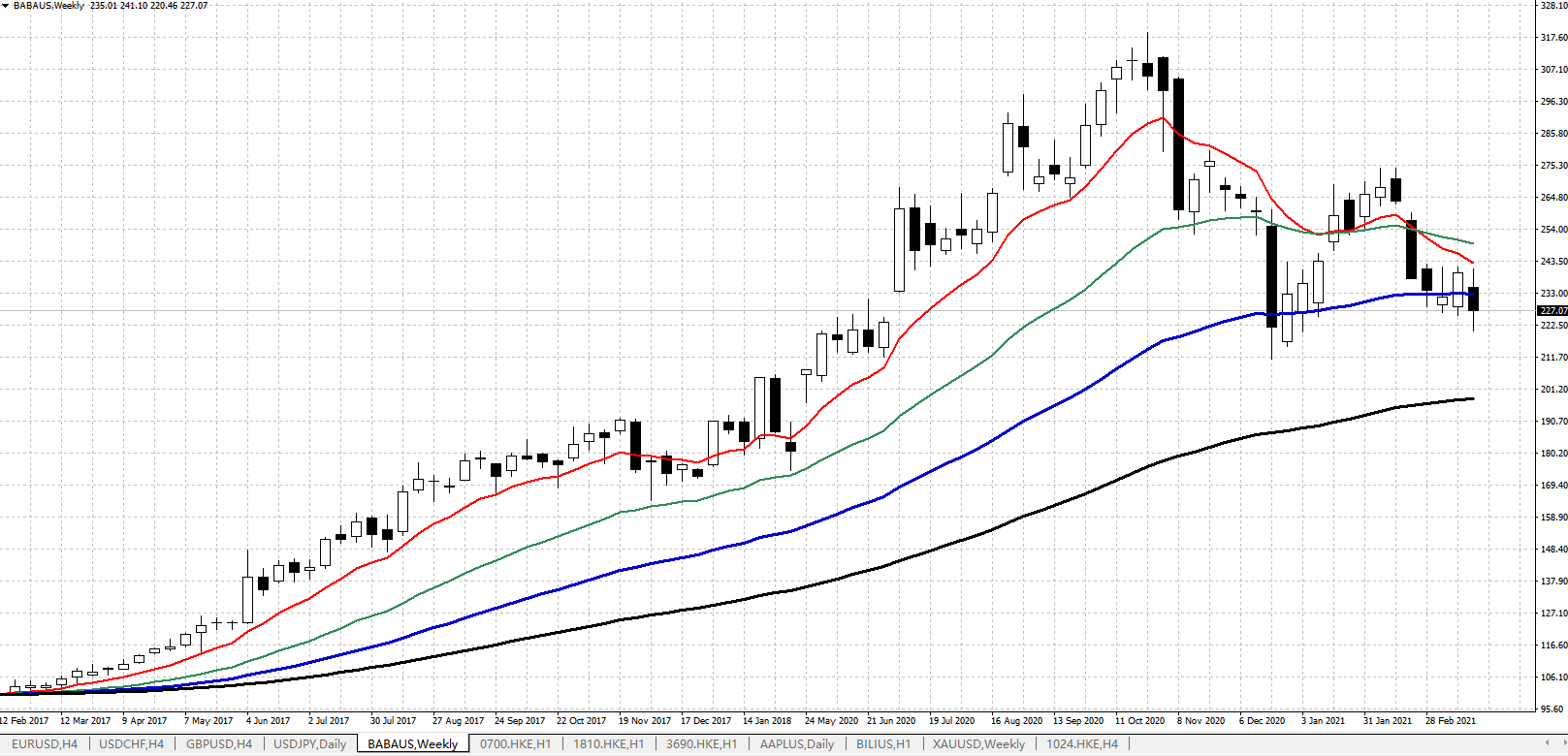 周线图上分析目前在233美元有一定支撑,在60周均线反复后,有继续回落到200美元附近可能。