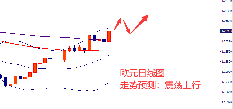 欧元周线图,欧元上周震荡上行,收盘在1.2100高位,周线以大阳线收盘,市场多头趋势延续。目前欧元多头力量释放后进入调整节奏,周初有调整上行的迹象,但上方依然需关注1.2200的压力。日线级别布林带开口运行,上轨压力在1.2140附近,中轨支撑在1.1940附近,均线系统形成多头排列,短线偏上行。MACD指标,上涨动能增加,零轴上方多头市场,整体看,欧元本周依然倾向于震荡上行,关注1.2200压力和1.1950支撑,保持低位做多的思路。