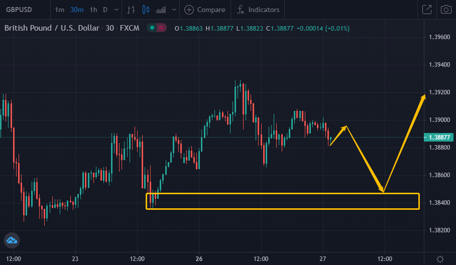 策略解析:英镑30分钟别价格可能会暂时出现回落调整走势,短线上暂时计划先空后多的操作,再根据实际走势情况调整策略计划。日内关注价格再次回抽1.3900一线附近的机会,可择机逢高做空英镑,下看目标1.3850一线附近;如果想逢低买入英镑的,可耐心等待价格跌至1.3850一线附近需求区后的K线反应,后续再做入场。
