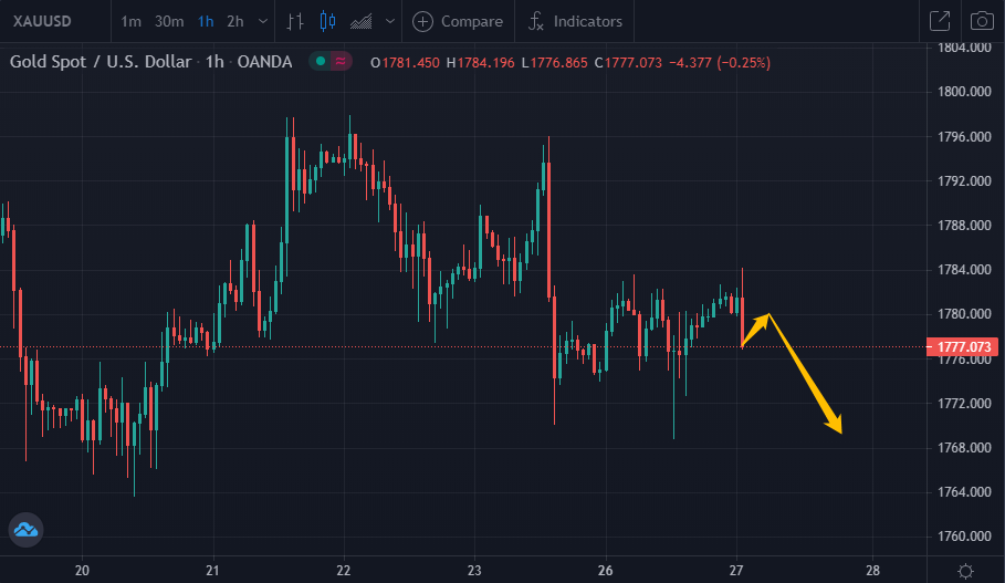策略解析:黄金小时级别出现上行乏力,并且有大级别的头部迹象形成,后市或将暂时的回调走势,不宜直接继续追多,而且耐心等待回调后的企稳形态出现。日内关注价格再次回抽1780一线附近的机会,可择机逢高做空黄金,短线暂时下看目标1770一线附近。