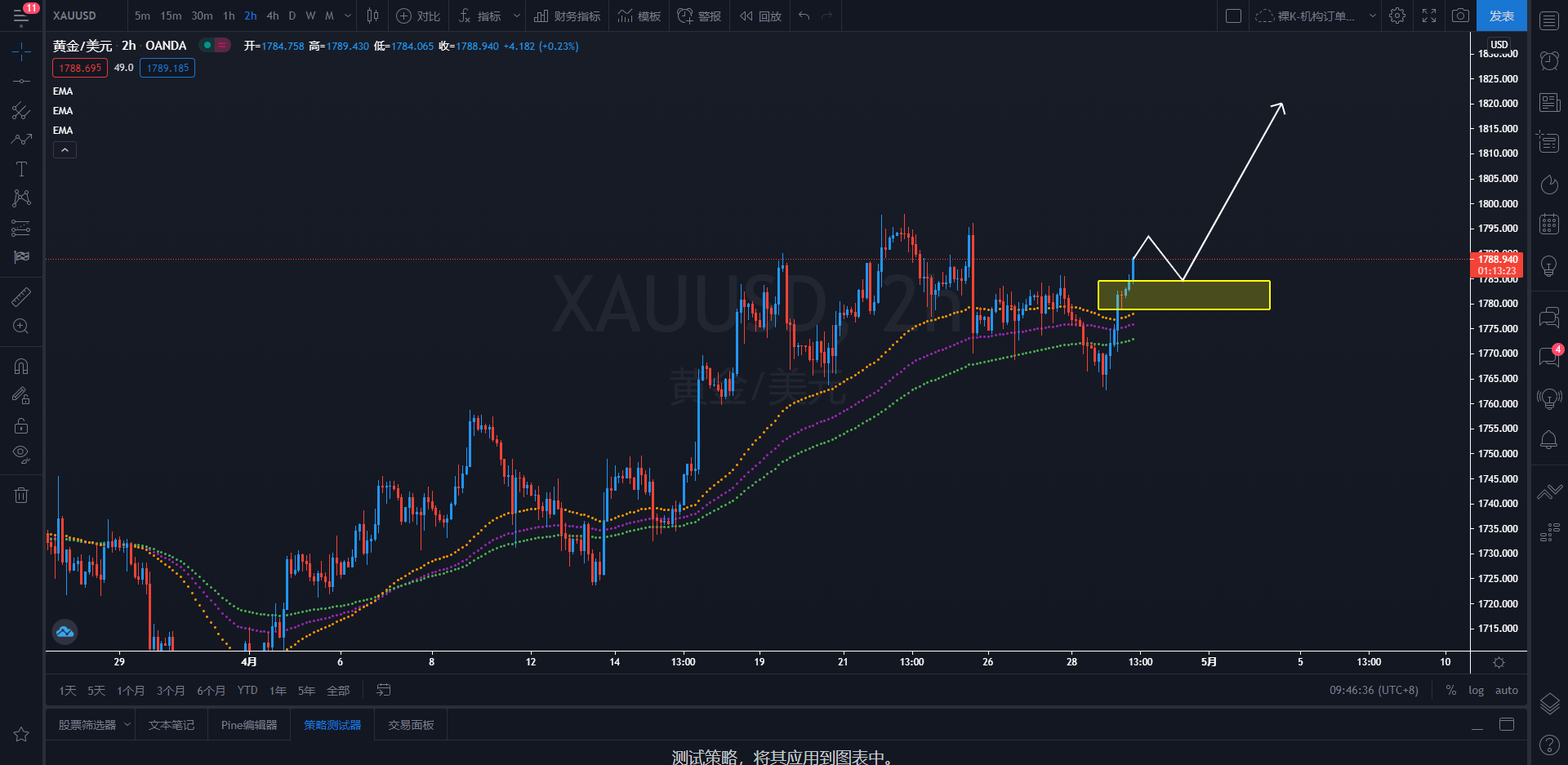 策略解析:黄金2小时级别价格出现探底回升的V反走势,价格再次回到均线系统的上方,后市或将继续延续升势,持续上行,保持逢低买入的思路。日内关注价格再次回踩1785-1779需求区的机会,可择机逢低买入黄金,上看目标1810、1820一线甚至更高。