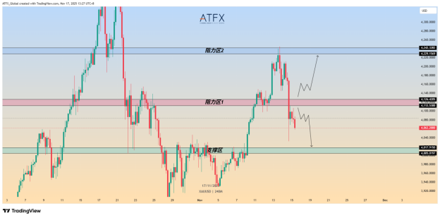 技术面显示,XAUUSD目前在4060美元附近震荡,位于图中阻力区1(约4112–4126美元)下方,而阻力区2位于前高4229–4242美元,是多头再度发力的上方关键位置。下方支撑则集中在4005–4017美元区间,与心理关口4000美元高度重叠,是全市场关注的核心枢纽。若金价反弹无法站稳阻力区1之上,本周数据若增强美联储鹰派倾向,金价可能继续在4000–4120美元区间内弱势震荡,甚至跌破4000美元并测试更低区域,正如Welsh所警告的那样,一旦跌破4000美元,下方或直指此前低点。