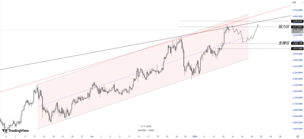 从图中的关键水平观察,4613–4650美元区域已构成明显的通道上轨阻力带,短期内追涨动能有所放缓,价格更可能以高位整理或回踩消化涨幅。下方来看,4509美元附近及更下方的4474美元区域,对应通道中轴与前期密集成交区,构成第一道关键支撑。只要价格仍运行在该支撑带上方,上升结构依然成立,回调更偏向“趋势内修正”,而非趋势反转。