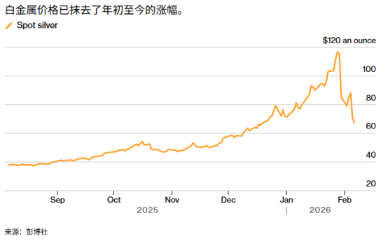 周四白银价格暴跌20%后继续下跌,流动性不足导致市场价格剧烈波动。现货白银在亚洲早盘交易中一度跌至每盎司64美元的低点。白银价格已较1月29日创下的历史高点回落超过40%,并抹去了上个月强劲反弹的所有涨幅。