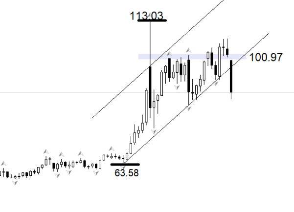 行情方面,ATFX分析师认为,日线级别,美原油今日暴跌,长阴线已经突破上升通道下轨,由于突破后行情向下运行了较长距离,目前基本可以判定突破有效。目前看来,3月9日形成的高点113.03作为中期阻力位依旧有效,接下来的下跌波段将会寻找新的中期支撑位,也就是中期的低点。如果美国和伊朗之间的谈判,最终在两周之后达成长期和平协议,那么前一个中期低63.58美元就极有可能被刷新。